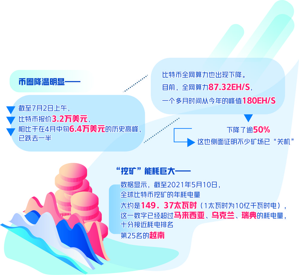 强监管之下,狂热的币圈已有明显降温迹象。截至7月2日上午,比特币报价3.2万美元,相比于在4月中旬6.4万美元的历史高峰,已跌去一半。比特币全网算力也出现下降,btc.com网站显示,目前全网算力87.32EH/S,一个多月时间从今年的峰值180EH/S下降了逾50%,这也侧面证明不少矿场已“关机”。