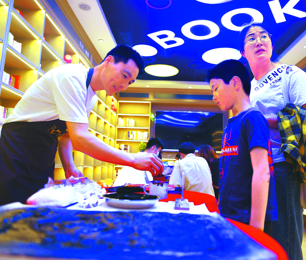 ⑤山东省日照市东港区“非遗”展演现场,小朋友在学习年画的套印方法。“非遗”体验活动吸引众多市民参与。