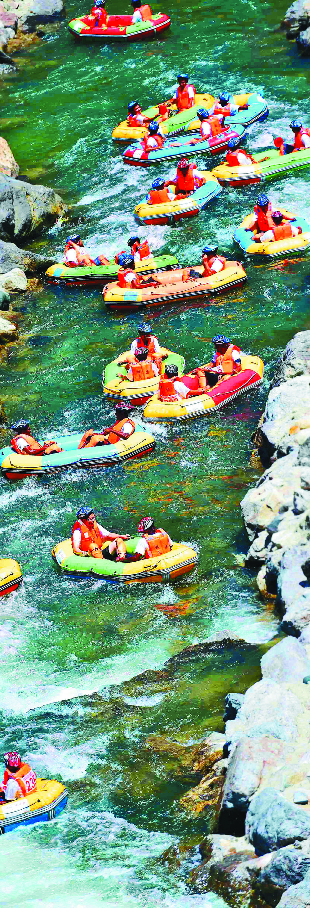 ①游客在湖北省兴山县朝天吼漂流景区体验漂流运动。该景区推进文化元素、体育元素和旅游元素的深度融合,将绿水青山转化成为乡村振兴的“金山银山”。