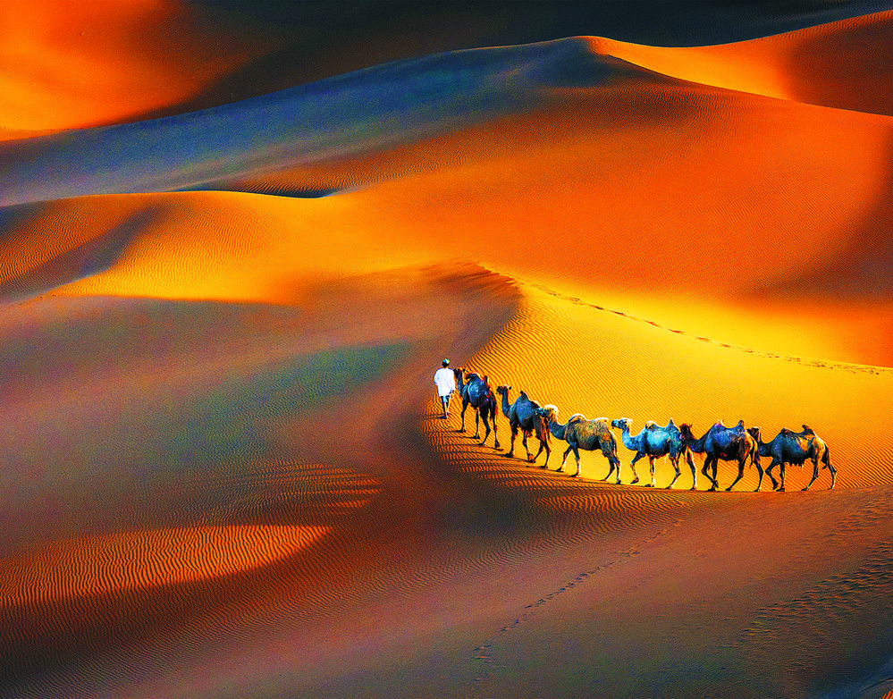 ②新疆维吾尔自治区吐鲁番市鄯善县的库木塔格沙漠雄浑壮观、驼铃叮当,吸引众多游人前来体验古丝路风情。