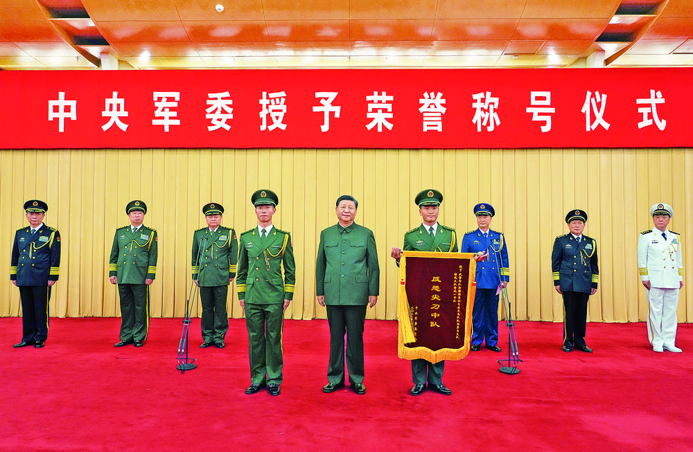 新华社北京7月5日电(记者梅常伟)中央军委授予荣誉称号仪式5日在京隆重举行。中央军委主席习近平向获得荣誉称号的单位颁授奖旗。