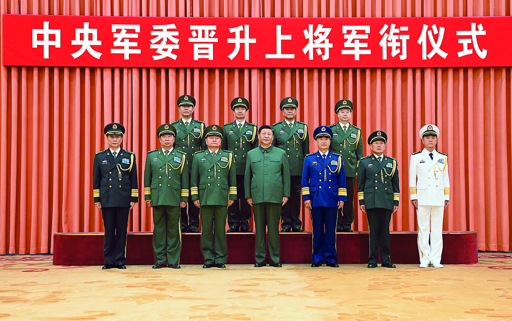 晋衔仪式在嘹亮的军歌声中结束。随后,习近平等领导同志同晋升上将军衔的军官合影。