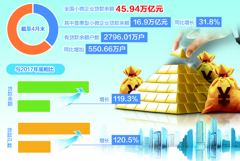 银保监会公布数据显示,截至4月末,全国小微企业贷款余额45.94万亿元,其中普惠型小微企业贷款余额16.9万亿元,同比增速为31.8%,较各项贷款增速高19.8个百分点;有贷款余额户数为2796.01万户,同比增加550.66万户。与2017年底相比,普惠型小微企业贷款余额、贷款户数都增长了1.2倍左右;其中,贷款余额增长119.3%,贷款户数增长120.5%。