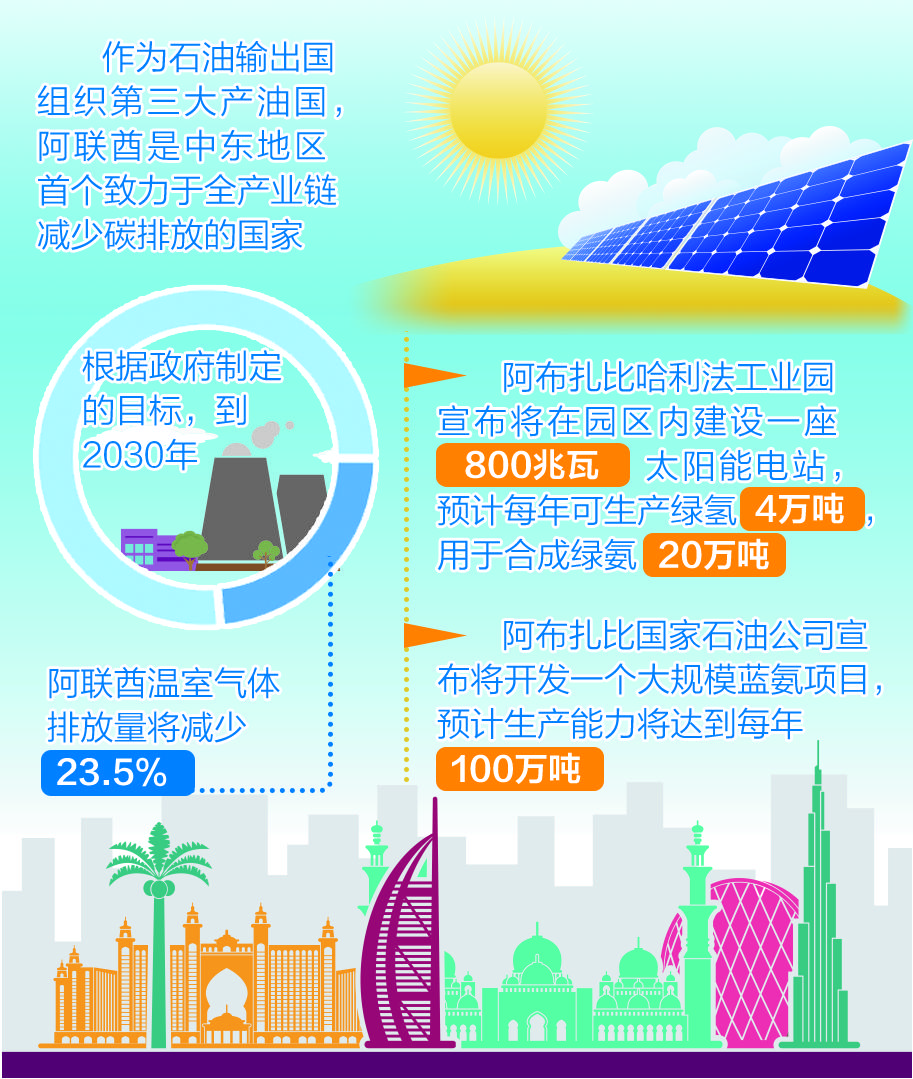 作为石油输出国组织第三大产油国,阿联酋是中东地区首个致力于全产业链减少碳排放的国家。根据阿联酋政府制定的目标,到2030年阿联酋的温室气体排放量将减少23.5%。为实现此目标,阿联酋全面推进能源改革进程,加速能源产业脱碳,利用自身在太阳能等清洁能源领域的优势大力发展绿氨产业,同时通过碳捕捉、封存和应用技术扩大蓝氨的生产规模,加快实现能源转型及经济多元化。