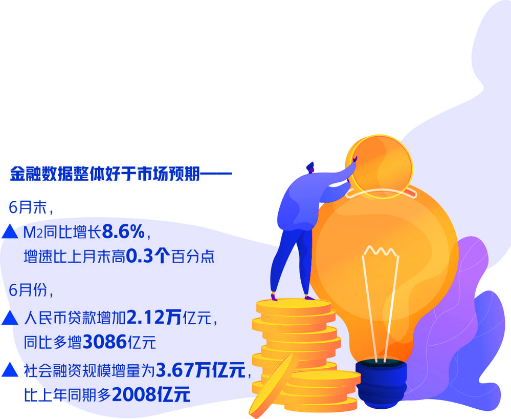 7月9日,中国人民银行发布的金融统计数据报告显示,6月末,广义货币(M2)余额231.78万亿元,同比增长8.6%,增速比上月末高0.3个百分点,比上年同期低2.5个百分点;6月份,人民币贷款增加2.12万亿元,同比多增3086亿元,社会融资规模增量为3.67万亿元,比上年同期多2008亿元。