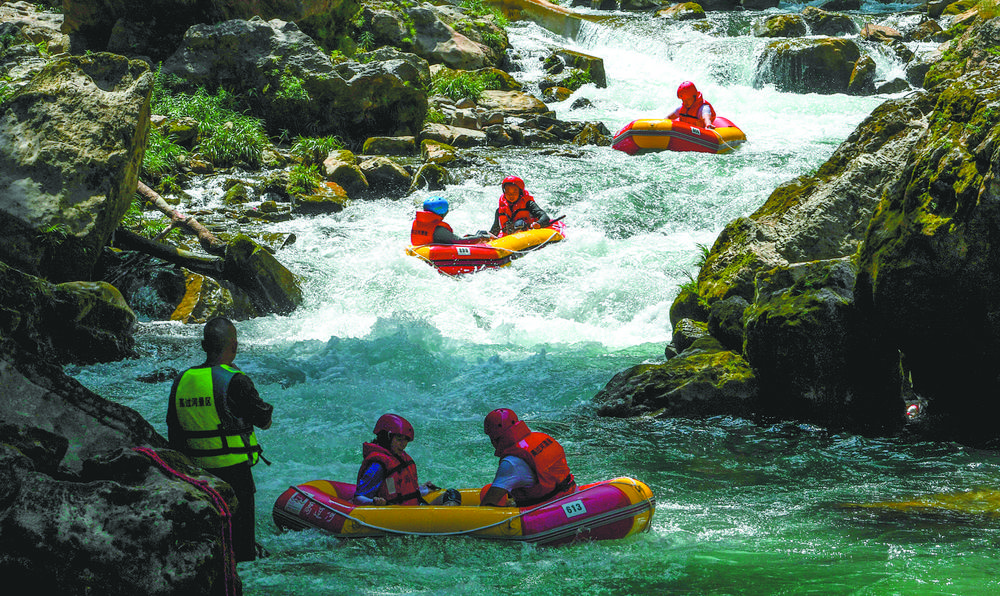 7月16日,游客在贵州镇远县高过河风景区漂流游玩。盛夏时节,高过河风景区气候宜人、风景秀丽,吸引各地游客前来避暑游玩,在青山绿水间度过一个凉爽的夏天。