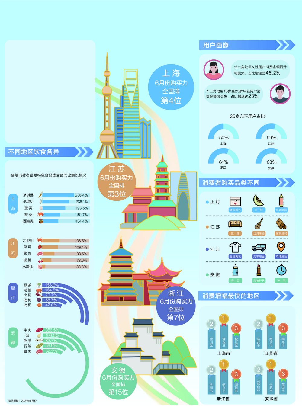 长三角地区消费者有什么特征?大数据给出了清晰画像。在这里,16岁至25岁的年轻用户消费提升快,占比增速达23%;在这里,女性用户消费增长迅速,占比提升至48.2%;上海和浙江等地消费者更偏爱服务消费。