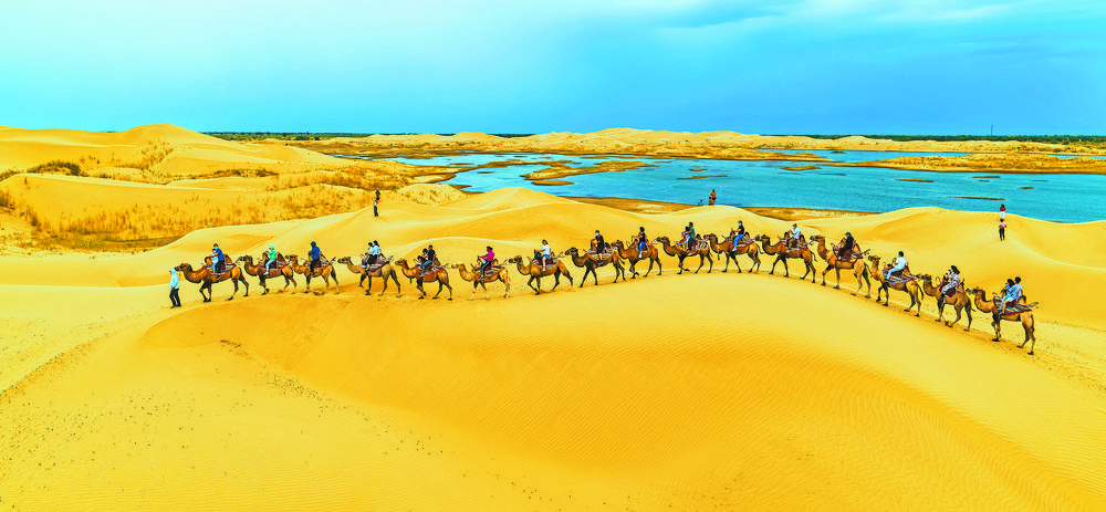 7月18日,新疆巴音郭楞蒙古自治州尉犁县罗布人村寨景区,游客骑乘骆驼游览神女湖环线沙漠景色。盛夏时节,当地沙漠旅游升温,大批游客前来欣赏塔克拉玛干沙漠、塔里木河、胡杨林的独特风光。李 飞摄(中经视觉)