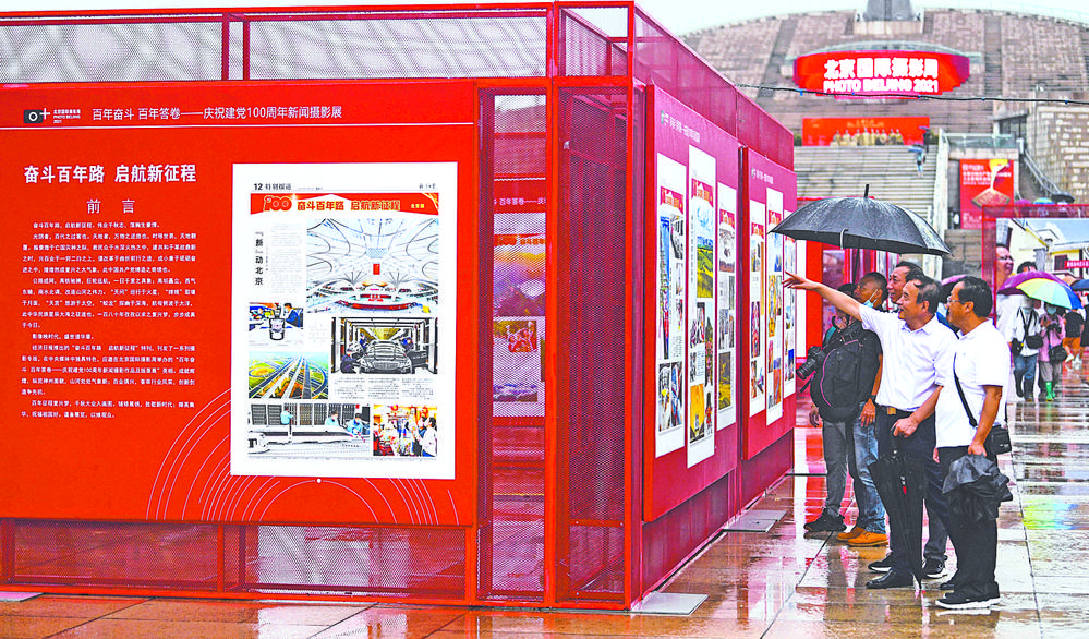 7月18日,2021年北京国际摄影周“百年奋斗 百年答卷——庆祝中国共产党成立100周年”新闻摄影展在中华世纪坛开幕。此次摄影展用300多个摄影专版和1000余幅新闻图片,全方位、立体化地展示中国共产党百年奋斗历程和巨大成就。图为观众在经济日报展区的摄影专版前参观。本报记者 翟天雪摄