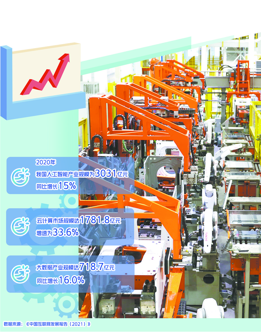 中国信息通信研究院院长余晓晖认为,我国经济增长为互联网发展提供了良好环境,互联网企业强劲的创新活力让网络迅速融入人们生活的各类场景,并形成新的商业和服务模式。而庞大的应用场景和消费需求也倒逼企业不断学习新技术。人工智能、大数据、云计算等新一代信息技术正加快与互联网深度融合。《报告》显示,2020年,我国人工智能产业规模为3031亿元,同比增长15%;云计算市场规模达1781.8亿元,增速为33.6%;大数据产业规模达718.7亿元,同比增长16.0%,增幅领跑全球大数据市场。