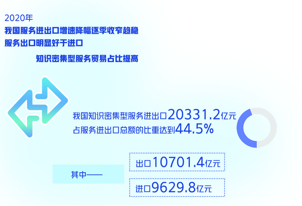 2020年,受新冠肺炎疫情影响,我国传统服务贸易大幅下滑,数字贸易逆势而上,知识密集型服务进出口额为20331.2亿元,同比增长8.3%,占服务进出口总额的比重达到44.5%,提升9.9个百分点。同年,跨境电商进出口总额达1.69万亿元,同比增长31.1%,成为货物贸易增长的有力支撑。