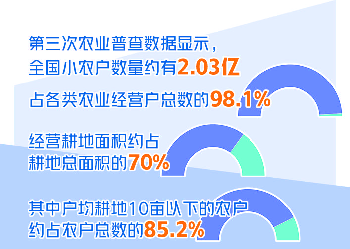 第三次农业普查数据显示,全国小农户数量约有2.03亿,占各类农业经营户总数的98.1%,经营耕地面积约占耕地总面积的70%,其中户均耕地10亩以下的农户约占农户总数的85.2%。人均一亩三分地、户均不过十亩田的小农生产方式,是我国农业发展需要长期面对的基本现实。