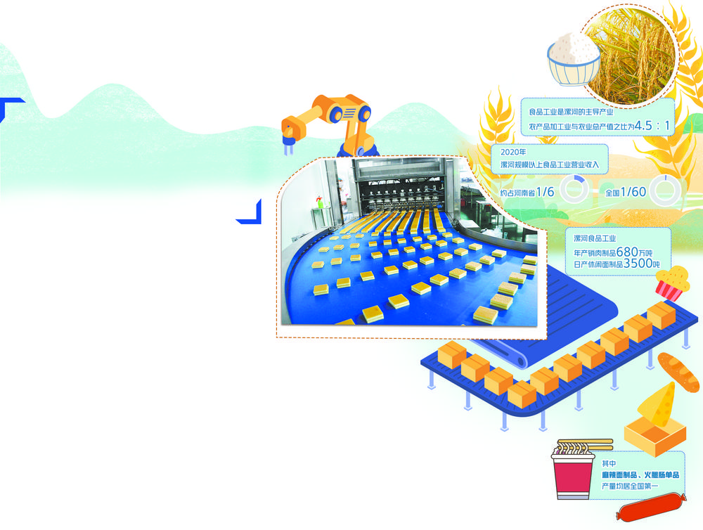 2020年漯河粮食总产量为190.7万吨,年加工转化粮食600万吨,规模化养殖率达90%以上。食品产业呈现集中度高、体量大、名企多、链条长的特点。农产品加工业与农业总产值比达4.5∶1,“纵横贯通、无缝衔接”的食品产业生态已成功打造。