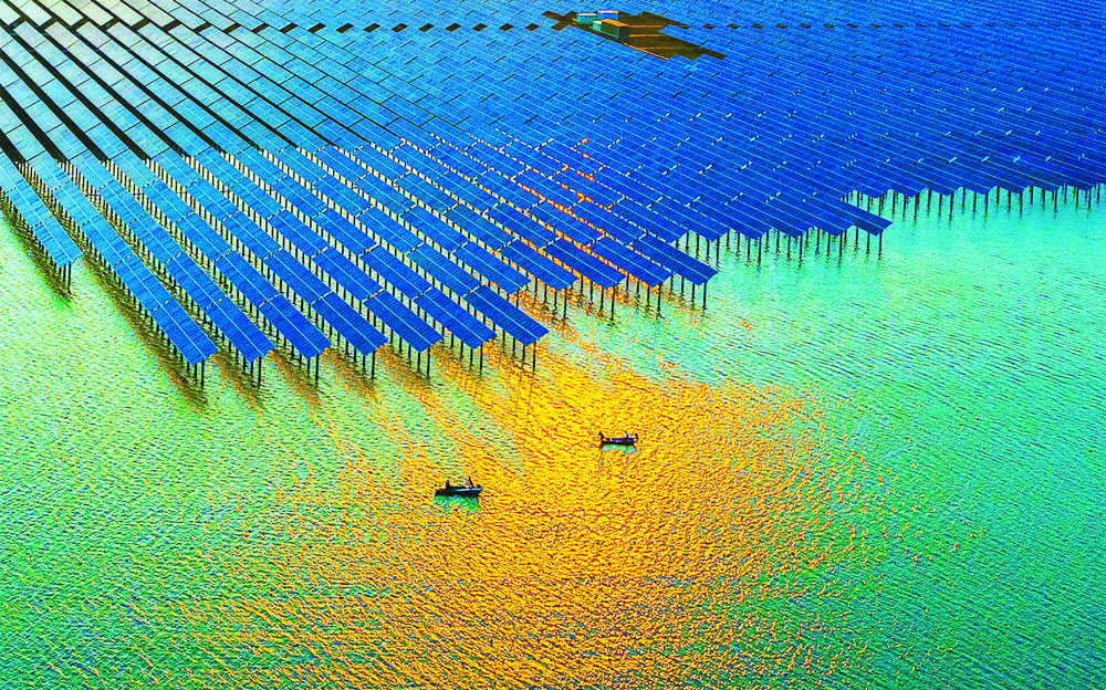 江苏泗洪县魏营镇先锋水库,岸上风车林立,水上光伏连片。近年来,当地紧紧围绕乡村振兴战略,充分挖掘当地资源优势,发展光伏、风力发电绿色新能源产业。张连华摄(中经视觉)