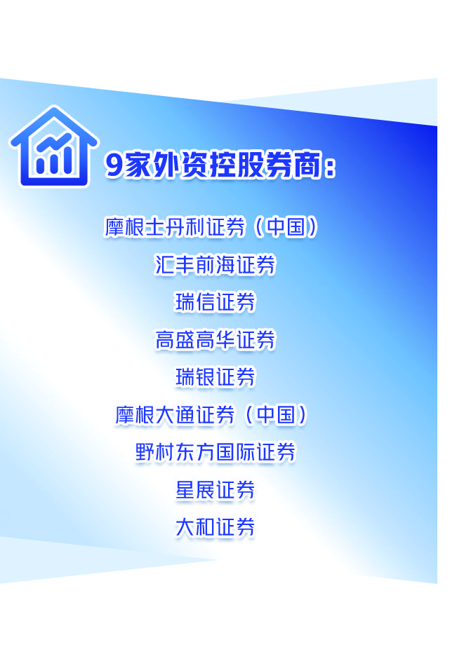 截至目前,外资控股券商已达到9家,分别为摩根士丹利证券(中国)、汇丰前海证券、瑞信证券、高盛高华证券、瑞银证券、摩根大通证券(中国)、野村东方国际证券、星展证券和大和证券。