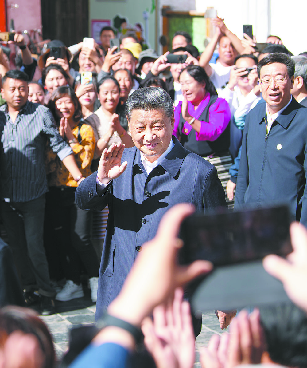 图② 22日下午,习近平在考察位于拉萨市老城区的八廓街时,向各族群众挥手致意。 新华社记者 申 宏摄