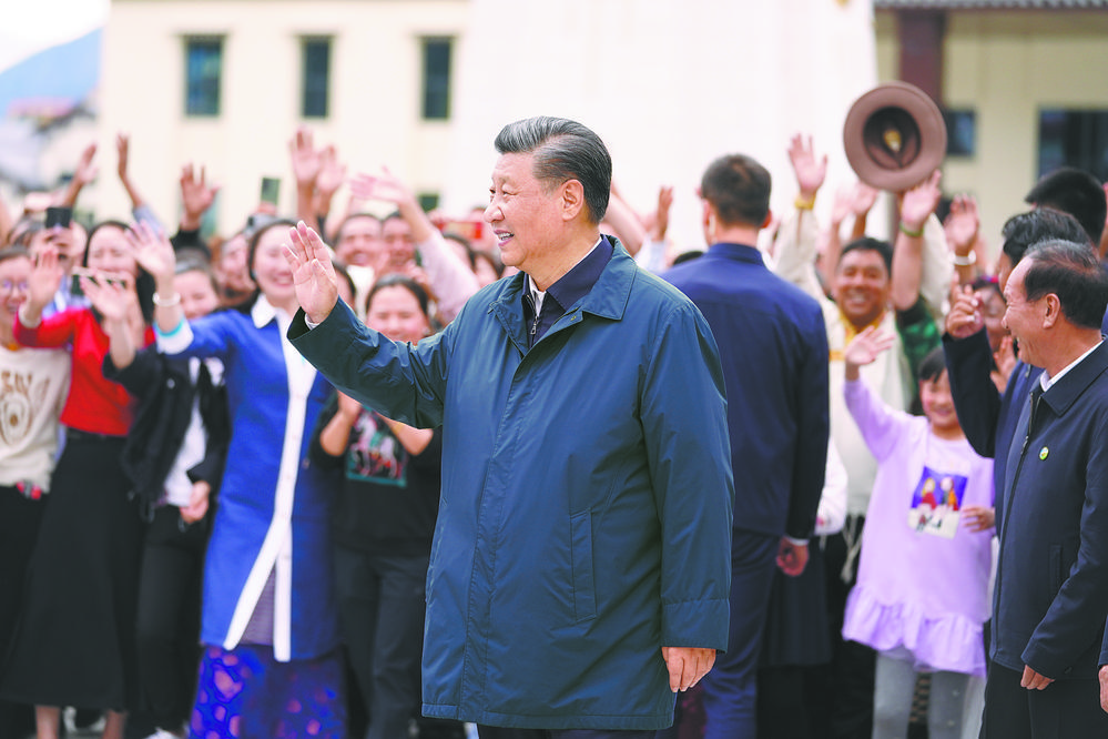图⑦ 21日下午,习近平在林芝市工布公园考察时,向当地群众和游客挥手致意。 新华社记者 燕 雁摄