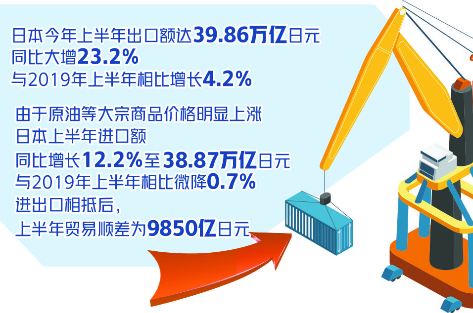 本报讯(记者苏海河)日本财务省7月21日公布的国际贸易统计速报显示,在中国、美国等海外主要市场需求带动下,日本今年上半年出口同比大增23.2%,超过新冠肺炎疫情暴发前2019年上半年的水平。为2010年上半年(37.9%)以来近11年的最大增幅。