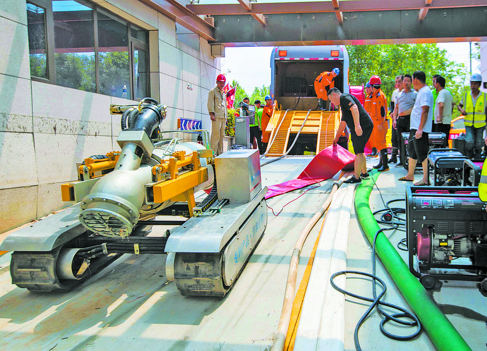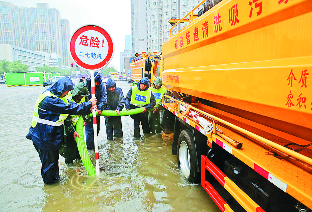 ◀7月20日,河南郑州城管局工作人员出动大型清淤车辆疏通下水道。面对汛情,当地城管系统干部群众坚守岗位,奋力抢险。李新华摄(中经视觉)