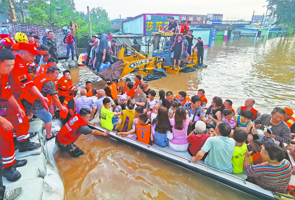▲7月23日,河南新乡救援人员在大块镇块村营村救援因洪涝灾害影响需要转移的群众。 张 琮摄(中经视觉)