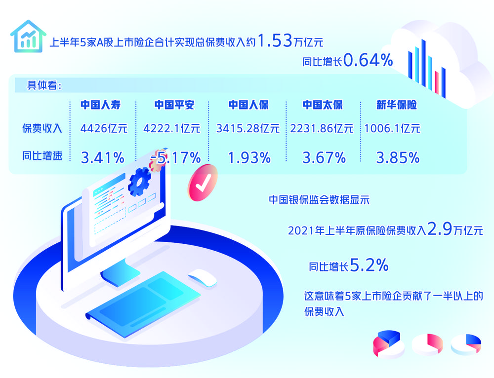 截至7月16日,5家A股上市险企上半年保费收入全部披露。数据显示,上半年5家A股上市险企合计实现总保费收入约1.53万亿元,同比增长0.64%,增速明显放缓。中国银保监会日前发布的数据显示,2021年上半年原保险保费收入2.9万亿元,同比增长5.2%。这意味着5家上市险企贡献了一半以上的保费收入。