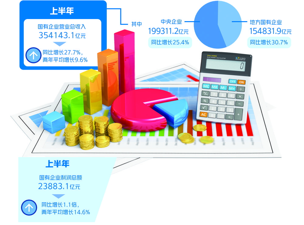 统计显示,1月至6月,国有企业营业总收入354143.1亿元,同比增长27.7%,两年平均增长9.6%。其中中央企业199311.2亿元,同比增长25.4%,两年平均增长8.0%;地方国有企业154831.9亿元,同比增长30.7%,两年平均增长11.8%。