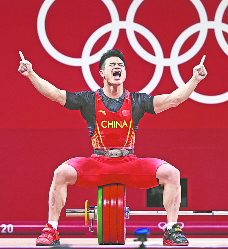 右上图 在举重男子73公斤级决赛中,石智勇摘得金牌并打破总成绩世界纪录。