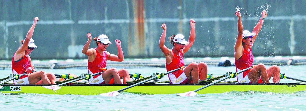 下图 在赛艇项目女子四人双桨决赛中,由陈云霞、张灵、吕扬、崔晓桐组成的中国队夺得冠军。