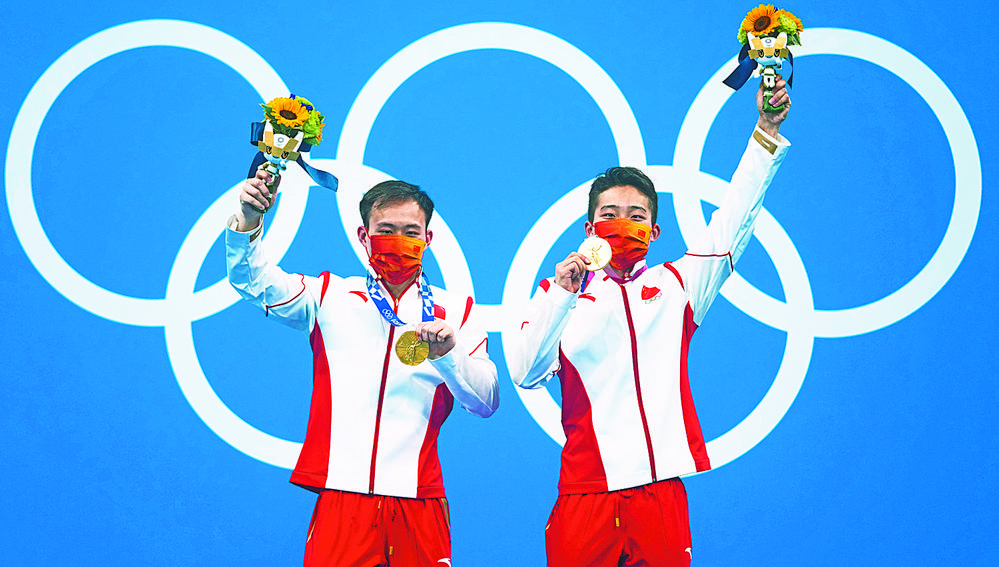 左上图 在男子双人三米跳板决赛中,谢思埸(左)/王宗源获得冠军。