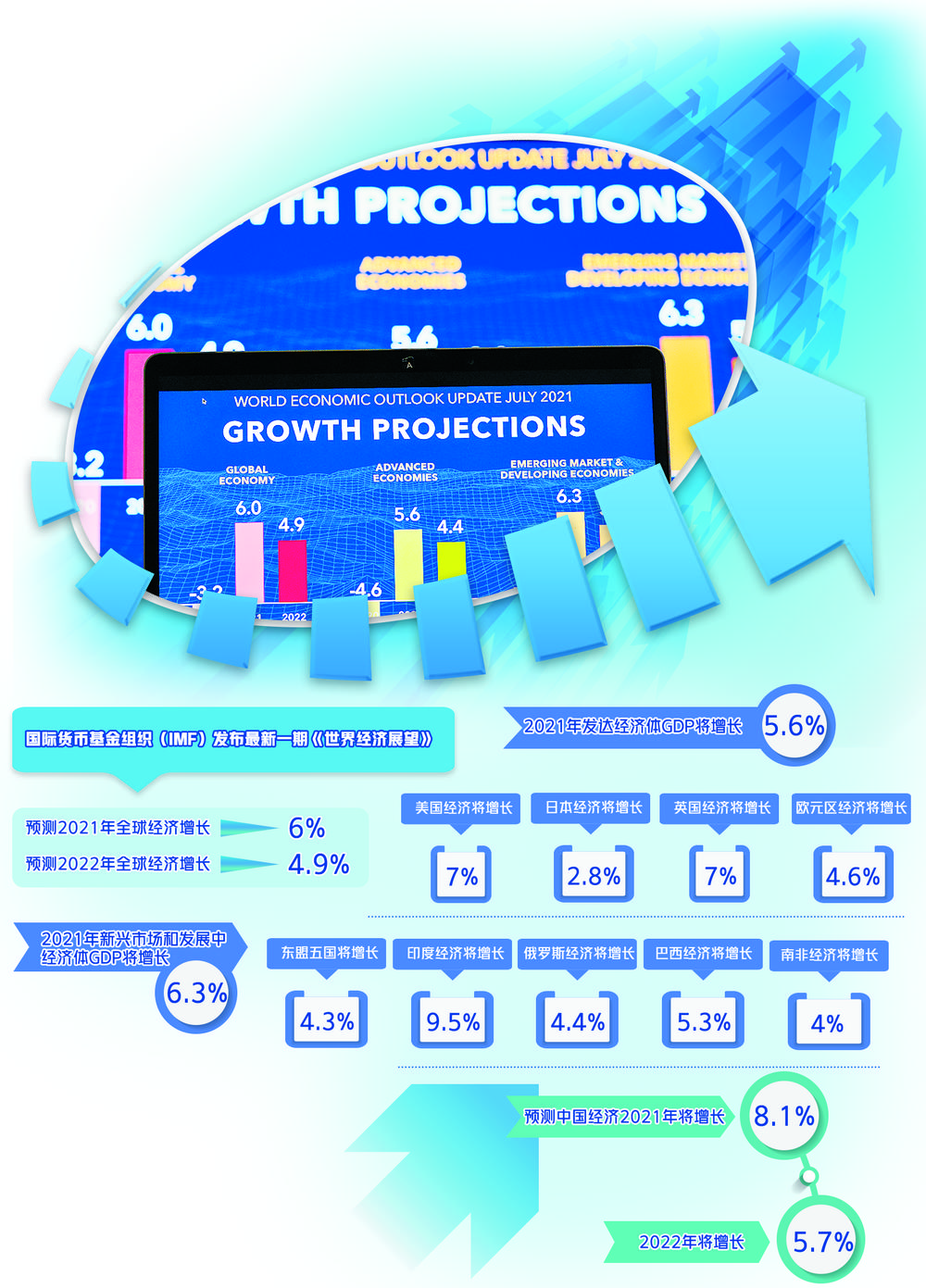 预测显示,2021年新兴市场和发展中经济体GDP将增长6.3%(下调0.4个百分点),其中东盟五国将增长4.3%(下调0.6个百分点),印度经济将增长9.5%(下调3个百分点),俄罗斯经济将增长4.4%(上调0.6个百分点),巴西经济将增长5.3%(上调1.6个百分点),南非经济将增长4%(上调0.9个百分点)。预测中国经济2021年将增长8.1%,与1月份预测相同,2022年将增长5.7%,相较4月份预测,上调0.1个百分点。