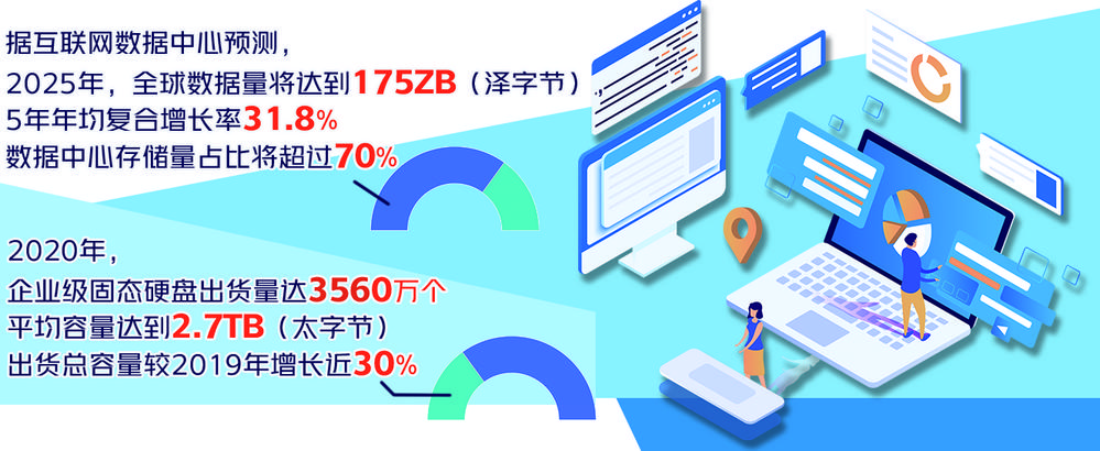 当前,全球正进入数字经济时代,各种大、中、小型数据中心已经成为数字经济的基础设施。大量新技术新商业应用将催生出对边缘计算和数据中心的海量需求。据互联网数据中心(IDC)预测,2025年,全球数据量将达到175ZB(泽字节),5年年均复合增长率31.8%,而数据中心存储量占比将超过70%。作为数据中心越来越重要的存储介质,企业级固态硬盘在2020年出货量达到3560万个,平均容量达到2.7TB(太字节),出货总容量较2019年增长近30%。