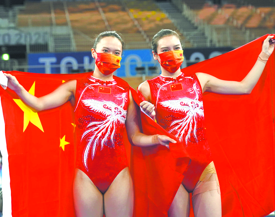 图① 在蹦床项目女子决赛中,朱雪莹(左)夺冠,刘灵玲获得亚军。新华社记者 程 敏摄
