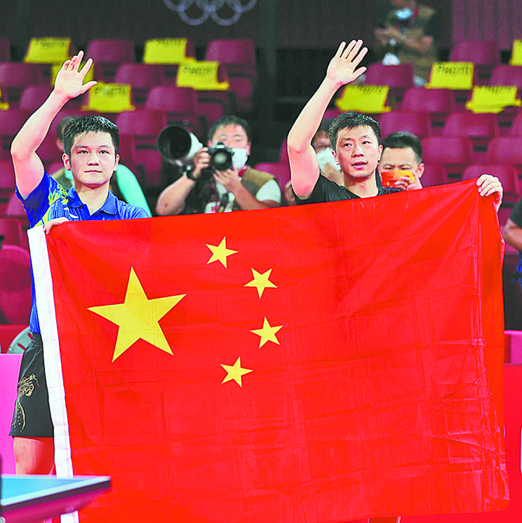 图② 在乒乓球男子单打决赛中,马龙(右)战胜队友樊振东摘金。新华社记者 王东震摄