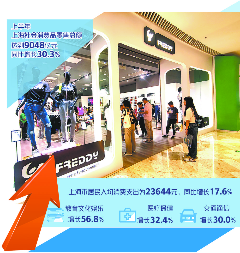 数据也印证了上海消费市场的红火。今年上半年,上海社会消费品零售总额达到9048亿元,同比增长30.3%,增幅高出全国7.3个百分点,消费支出延续了恢复性增长。