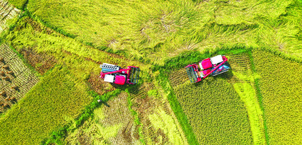 8月1日,湖南省永州市道县祥霖铺镇立福洞村,来自河南跨省作业的农机人员正在抢收早稻。连日来,道县27万多亩早稻成熟,来自河南、安徽、江苏等地的农机人员跨省进行收割作业,加快夏收进度。
