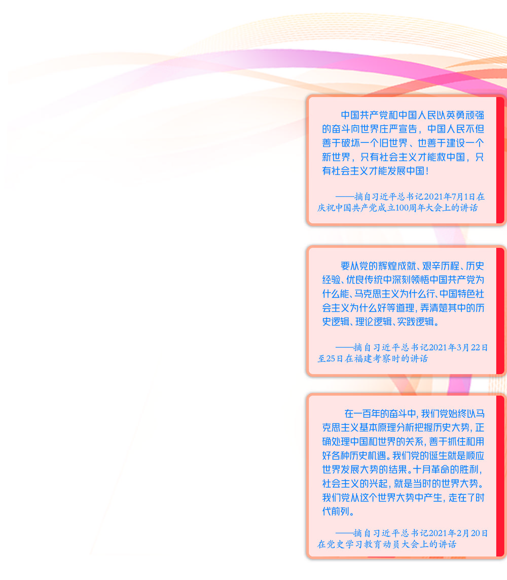 习近平总书记在庆祝中国共产党成立100周年大会上的重要讲话中指出:“以史为鉴、开创未来,必须坚持和发展中国特色社会主义。”走自己的路,是党的全部理论和实践立足点,更是党百年奋斗得出的历史结论。中国特色社会主义是党和人民历经千辛万苦、付出巨大代价取得的根本成就,是实现中华民族伟大复兴的正确道路。只有坚持和发展中国特色社会主义,才能实现中华民族伟大复兴。