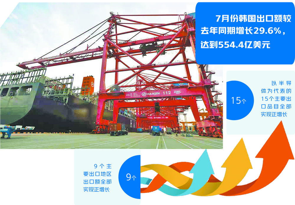 韩国产通部发表的《韩国7月进出口动向》显示,7月份韩国出口额较去年同期增长29.6%,达到554.4亿美元,这不仅是韩国历年7月份出口额的最高值,也是韩国有数据统计以来的单月出口额极值。特别是以半导体为代表的15个主要出口品目全部实现正增长,9个主要出口地区出口额也全部实现正增长,对美国和欧盟地区的出口更是保持了连续11个月的增长态势。1月份至7月份,韩国累计出口额达到3587亿美元,同样创下了历年同期的第一。