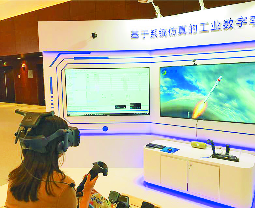 数字技术也在赋能制造产业。近年来,数字孪生应用已从航空航天领域向工业各领域全面拓展。在展区一侧,借助基于系统仿真的工业数字孪生技术,戴上VR眼镜,就可身临其境体验空间站发射入轨的过程。