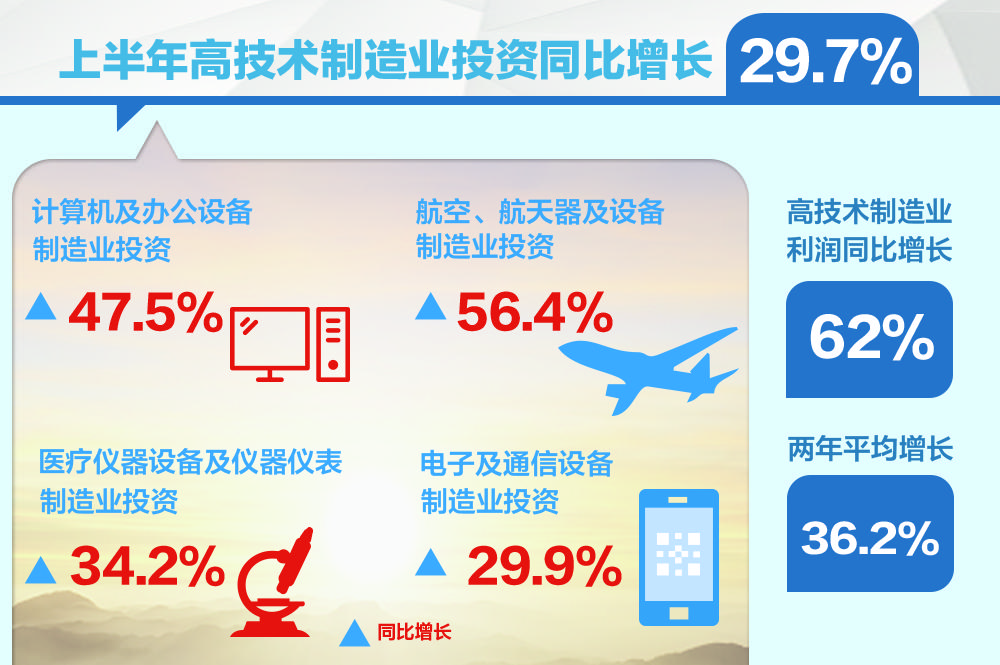 今年上半年,我国制造业投资同比增长19.2%,高于全部投资6.6个百分点,表明市场投资信心不断增强。其中,高技术制造业投资增长29.7%,更是一马当先。