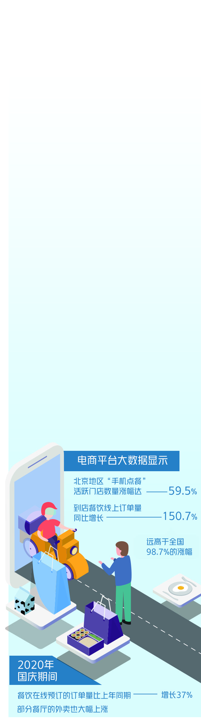 重创之下的餐饮业能表现出强劲的复苏态势正是源于此。2020年国庆期间,餐饮在线预订的订单量比上年同期增长37%,部分餐厅的外卖也大幅上涨。比如,北京同和居3家门店去年国庆期间外卖收入同比增长超700%,华天二友居同比增长超100%。国家统计局发布的数据也充分印证了这一点。2020年10月,餐饮收入4372亿元,同比增长0.8%,增速年内首次转正。
