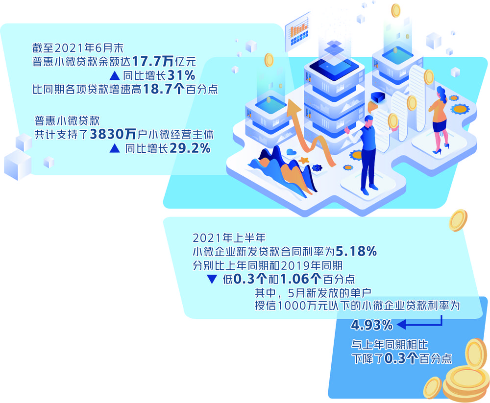 从量的角度看,截至2021年6月末,普惠小微贷款余额达17.7万亿元,同比增长31%,比同期各项贷款增速高18.7个百分点;普惠小微贷款共计支持了3830万户小微经营主体,同比增长29.2%。