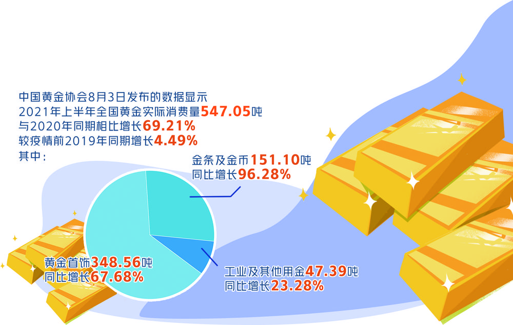 中国黄金协会8月3日发布的数据显示,2021年上半年全国黄金实际消费量547.05吨,与2020年同期相比增长69.21%,较疫情前2019年同期增长4.49%。其中:黄金首饰348.56吨,同比增长67.68%;金条及金币151.10吨,同比增长96.28%;工业及其他用金47.39吨,同比增长23.28%。