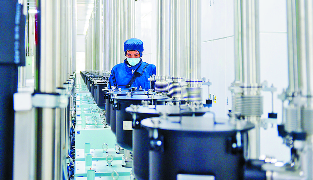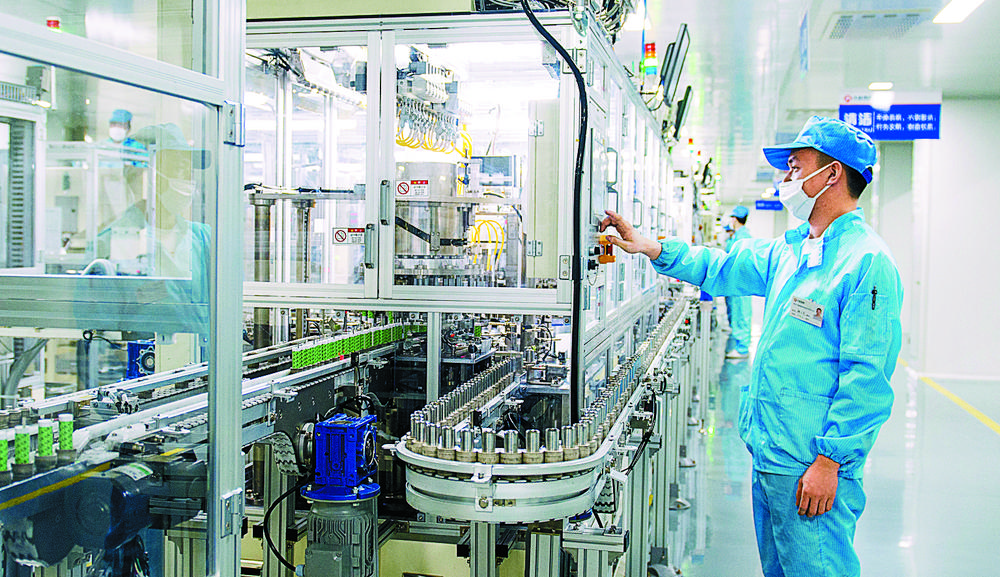 浙江长兴县天能帅福得公司全自动化智能生产线,员工在生产锂电池电芯。近日,该公司为海全新能源汽车配套的第10001套动力电池系统正式下线,这套系统是一款高安全、高智能、长续航的动力电池系统。尹 月摄(中经视觉)