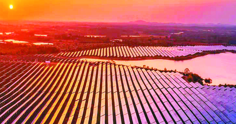 江西樟树市刘公庙镇光伏基地在夕阳映照下熠熠生辉。近年来,该市大力发展清洁能源,利用闲置山地、水库、屋顶,推进光伏产业发展,带动群众增收致富。 陈 晗摄 (中经视觉)