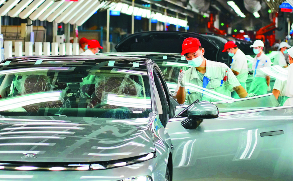 广东肇庆小鹏汽车智能网联科技产业园,员工检查即将下线的汽车。粤港澳大湾区着力布局新能源汽车产业,目前已初具规模优势。 本报记者 赵 晶摄