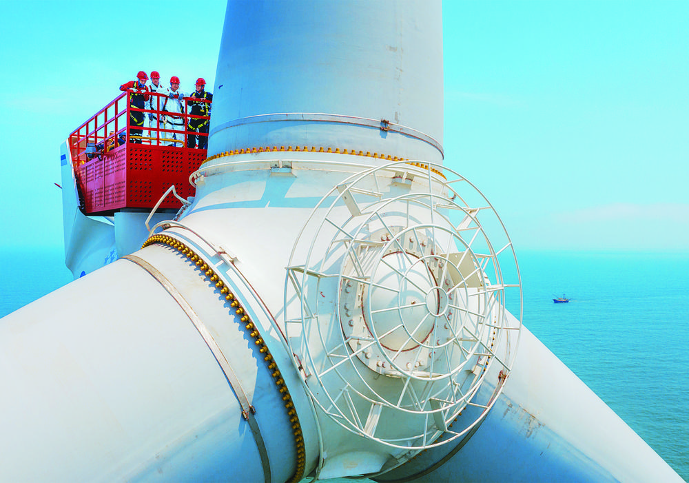 广东珠海市珠海金湾海上风电场,技术人员在进行定检、辅控安装。邱新生摄(中经视觉)
