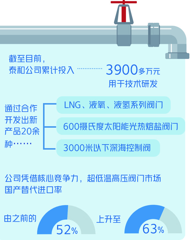 试验、失败,再试验、再失败……经过10多年的潜心钻研,2015年,泰和公司攻克了大型超低温高压高磅级阀门的核心技术,自主创新出20多项新产品和流体控制工程技术,打破了西方国家对该技术的垄断。截至目前,企业累计投入3900多万元用于技术研发。同时,公司斥资在德国法兰克福成立了研发中心,组建培育了专业研发队伍。通过合作开发出LNG阀门、液氧、液氢系列阀门,600摄氏度太阳能光热熔盐阀门,以及3000米以下深海控制阀等新产品20余种,均取得阶段性成果,成为全国首家被中国石油和石化工程研究会授牌的全国超低温阀门技术研究中心。