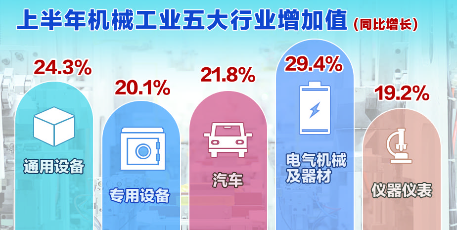 机械工业主要涉及的5个国民经济行业大类,通用设备制造、专用设备制造、汽车制造、电气机械及器材制造和仪器仪表制造业上半年增加值同比分别增长24.3%、20.1%、21.8%、29.4%和19.2%,两年平均增速均超过8%。