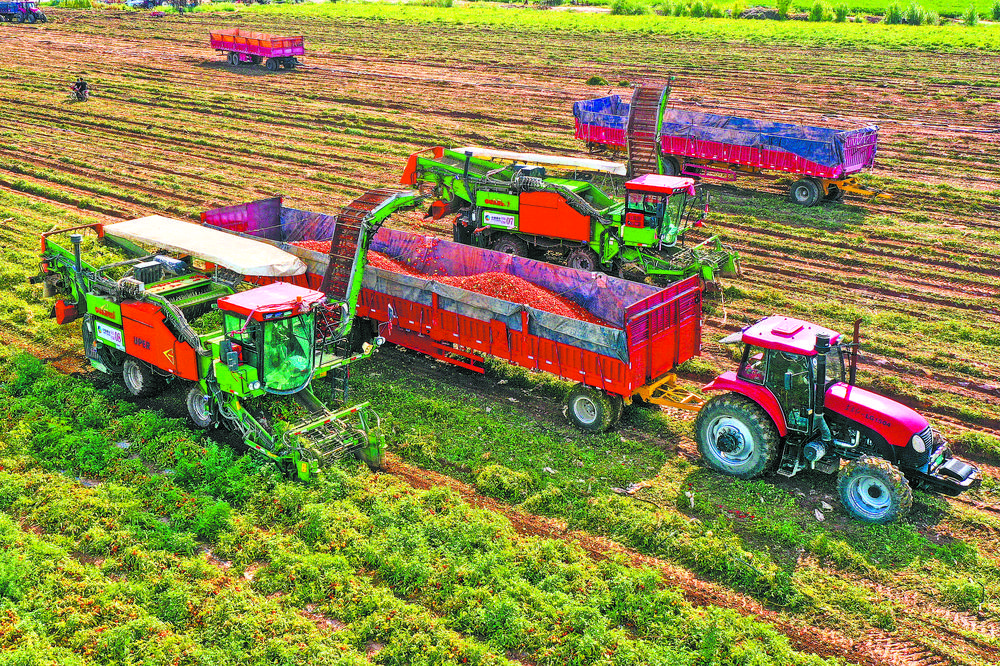 八月五日,采摘机在新疆昌吉回族自治州呼图壁县东滩村田间采收番茄。今年该县种植的近三万亩番茄喜获丰收。马光元摄(中经视觉)