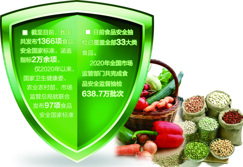 截至目前,我国共发布1366项食品安全国家标准,涵盖指标2万余项。仅2020年以来,国家卫生健康委、农业农村部、市场监管总局就联合发布97项食品安全国家标准。这些国家标准对食品的原料、辅料、外观、营养元素、添加剂、微生物等指标做出了详细规定,为食品安全提供了基础性制度保障。